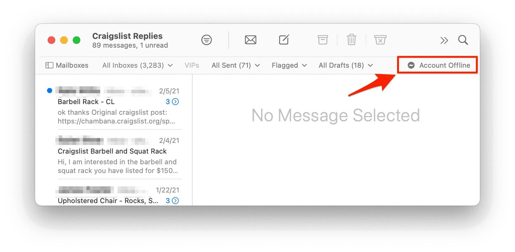 If you have multiple email accounts, you can take all accounts online by clicking the lightning bolt icon or choosing Mailbox > Take All Accounts Online. Alternatively, you can bring a specific account online by clicking the lightning bolt icon next to its mailbox or choosing Mailbox > Online Status > Take [account] Online.